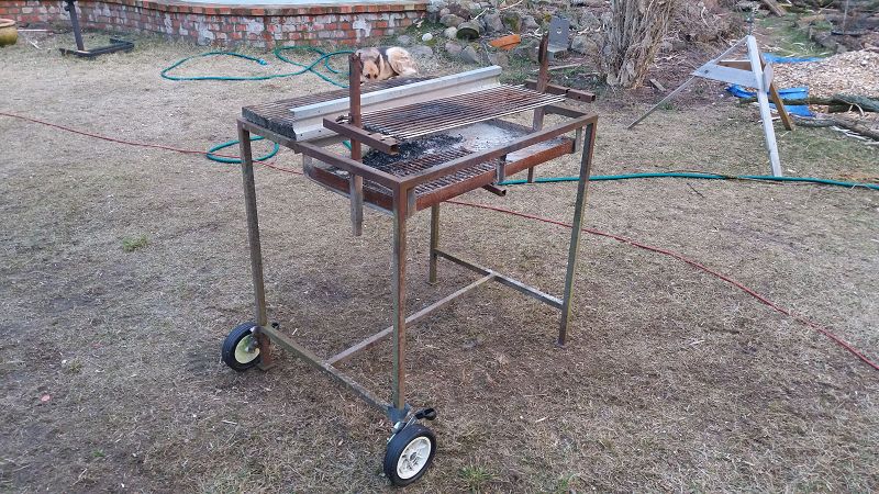 Das wird ständig optimiert, klar kann ich da einen Drehspieß dran machen, und auch von der Seite grillen. Klar rostet die Platte unten so alle 2 Jahre durch, darum hats jetzt nen Winkelstahlrahmen, und ich muss nur noch das Blech zuschneiden. Klar war ich es irgendwann leid, um Hilfe zu bitten, um das Ding woanders hinzustellen. Da hab ich dann Räder von nem schrottigem Rasenmäher angeschweißt und ne einklappbare Zugstange. Selbstverständlich kann man da schön den DO in angenehmer Höhe anrichten.