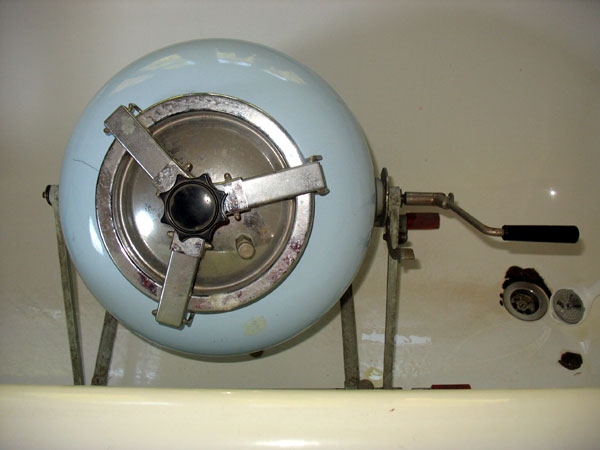 Dann habe ich das Ding einige Male gedreht und etwa eine Stunde lang einweichen lassen, zwischendurch immer mal wieder gekurbelt. Anschließend habe ich die Trommel geöffnet, die Wäsche gestampft und sie danach per Hand unterm Wasserhahn kalt durchgespült. Da sie allerdings noch nicht ansatzweise sauber war