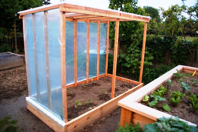Wir haben unserer Dach für das Tomatenhaus aus Kunststoffwellplatten gemacht und die Wände aus Gitterfolie.