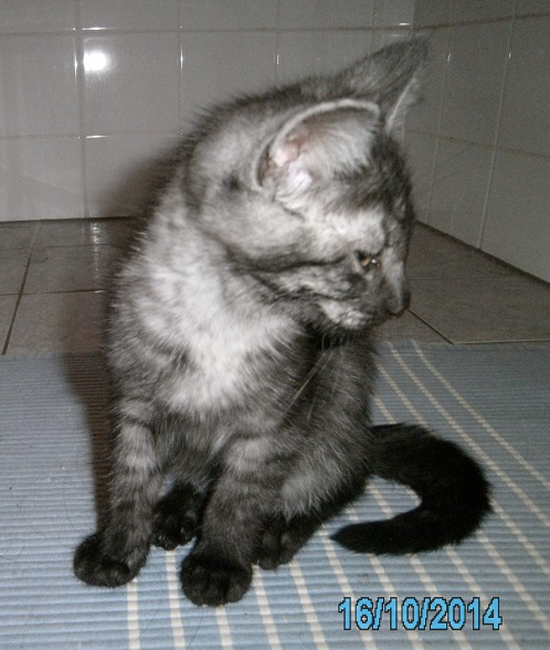 Laut Tierärztin ist der Kater ca. 3 bis 4 Monate alt, kommt schon ohne Mama aus (??) und wirkt gesund.