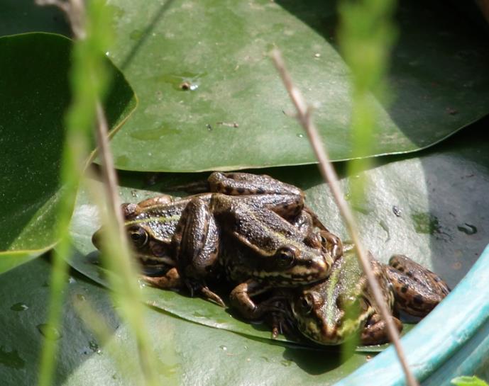 Zwei etwa gleichgroße männliche Frösche schwammen erst quakend rum, dann sind sie aufeinander losgegangen. Ich glaub, die haben sich gebissen