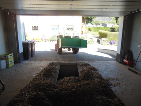 Die 10% Wassergehalt mehr bezüglich maschinengetrockneten Schnitzeln mit nur 10% Restfeuchte sind schätzungsweise etwa 50 kg Wasser pro Schüttmeter. Die zu verdunsten kostet etwa 2.3 MJ/kg Wasser, sind insgesamt also 50*2.3/(3.6MJ/kWh) = 31 kWh pro Schüttmeter, die dir nicht nutzbringend zur Verfügung stehen. Die könntest du allerdings zurückgewinnen, wenn du das Abgas unter den Kondensationspunkt abkühlen würdest.