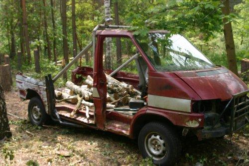 Den Wald hab ich ja "am Haus", so das das Holz mit diesem prachtvollen Gefährt auf dem Grundstück bewegt wird: Im Freien getrocknet wird meist, wo es anfällt.