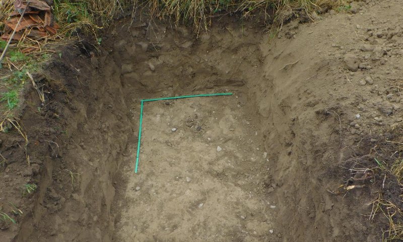 Ich habe vorgestern, wie im Bild zu sehen ist, ca. 1,2mx2m, bis zur Kiesschicht ausgegraben. Heute habe ich noch ca. 60cm Kies abgegraben. Dabei entsteht allerdings ein Trichter und ich muss mir eine Abstützung einfallen lassen. Bei strömenden Regen musste ich für heute leider früher aufhören.