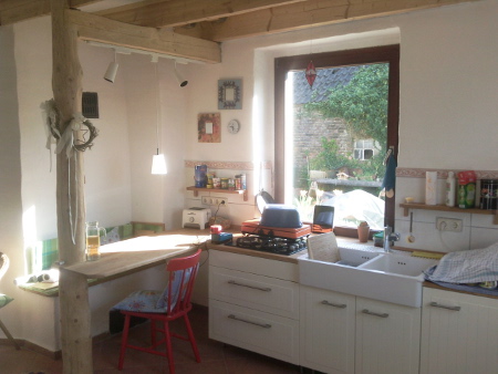 In den anderen Räumen kommt die produzierte und durch Kanäle verteilte heiße Luft (kein Wasser) in Kaminwänden an. Hier im Bild die Küche, die Kaminwand ist in den Rücksitz und Sitz der Bank hinter dem Tresen links im Bild integriert. Unten und oben sieht man die Luftklappen für die Schnellaufheizung des Raumes per Luftaustausch. Diese Klappen werden dann später geschlossen und der Wandkörper heizt sich auf.