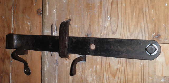 Hier habe ich den fehlenden Riegel durch ein zurechtgebogenes und -gefeiltes Stück eines alten Türbands ersetzt.