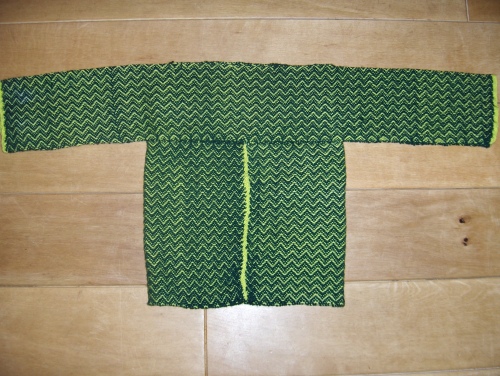 Der Pullover ist in zwei Teilen gewebt, Körper und Ärmel, der Kopfausschnitt ist gleich mit eingewebt.