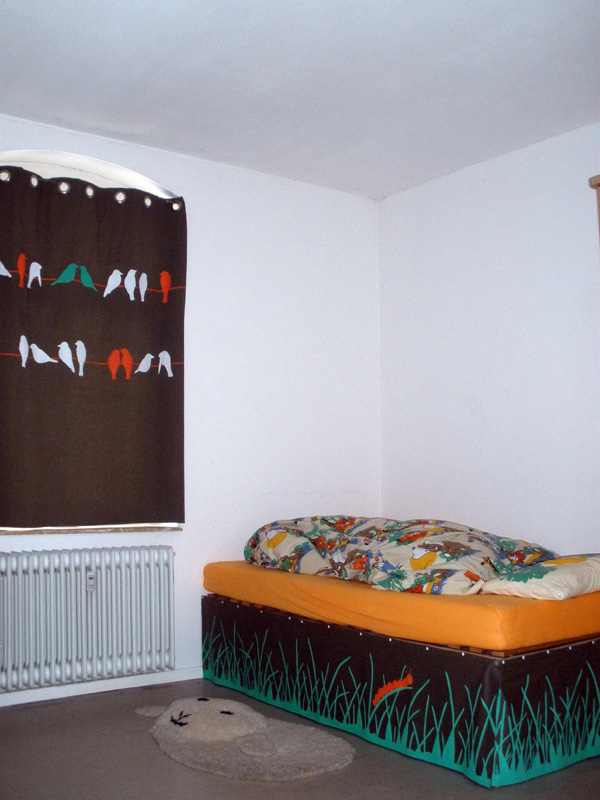 So sieht meine Schlafecke mit Bett und Vorhang aus: