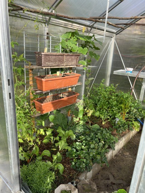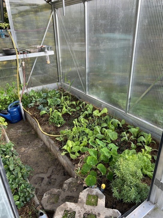Bis eben im Gewächshaus. Hab vorgezogenen Salat und Chinakohl eingepflanzt und Radieschen und Feldsalatgesät, damit wir im Winter was zum essen haben. :)