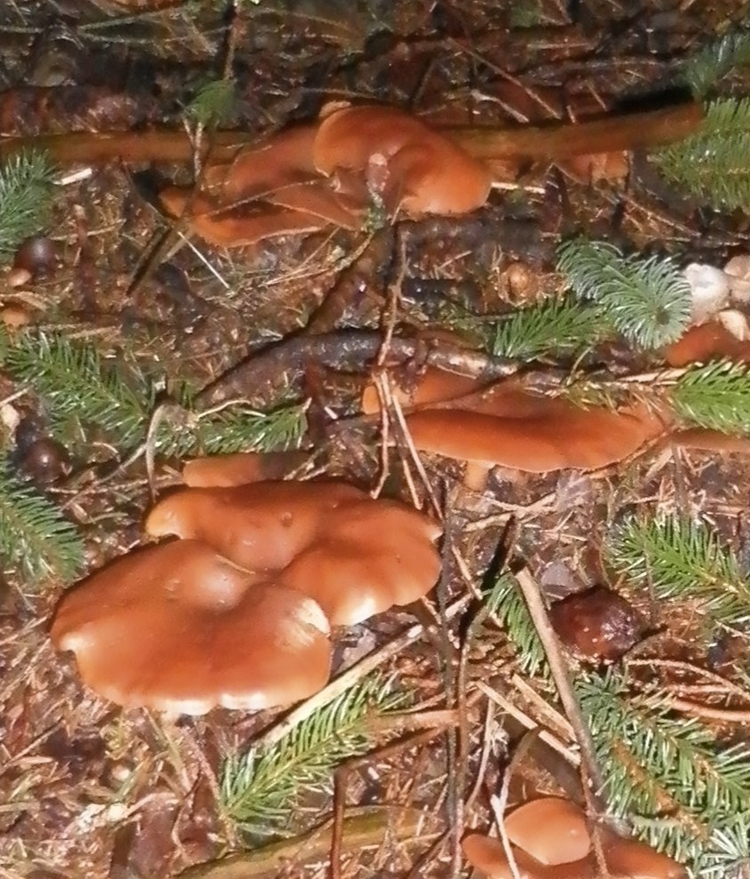 Bild 2 lässt sich nicht sicher bestimmen, ich glaube aber eher,dass es sich um fuchsige Rõteltrichterlige handelt, besonders weil sie im Fichtenwald wachsen. Für eine halbwegs sichere Bestimmung braucht man mindestens ein Foto von oben, von unten und ein Schnittbild.