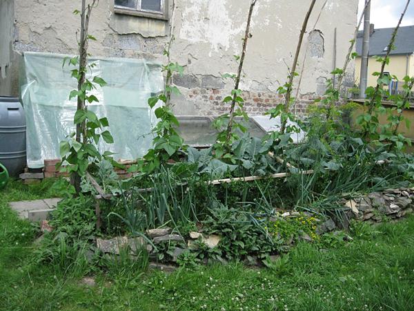 Auf dem davorliegenden Beet sind Stangenbohnen, Brokkoli, Mangold, Sellerie auch recht ordentlich, wenn auch etwas angeknabbert von den Schnecken.