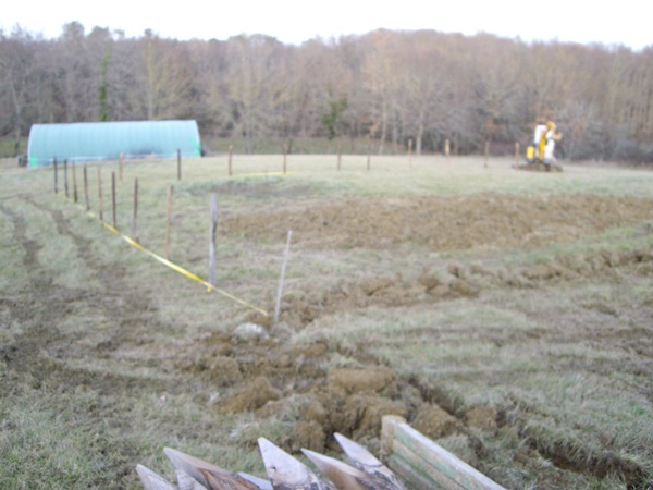 Dann drückt er mir noch die Akazienpfähle mit der Baggerschaufel rein, neben den Teichen nochmals 11x11 m für einen formalen Kräutergarten, 22 x 22 m für den grossen Gemüsegarten. Und rundum ist die Ziegenweide, also muss ich den Maschendraht besonders gut befestigen.
