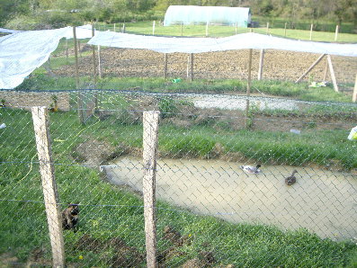 Der "Entengarten" mit versenktem Zaun kriegt noch ein Schutznetz drüber, und tägliche zwecklose Versuche mit Schattiergewebe. Was in der CH Sturm heisst, ist hier der übliche Frühlingswind. Keine Chance. Und die gepflanzten Sträucher (wieder ein paar aus dem Topf), sind noch viel zu klein.