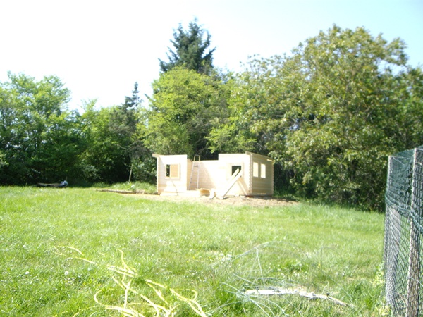 Oben links sieht man noch das fertige Gartenhaus. Auf die verfestigte Kiesschicht kommen Betonplatten unter die Tragebalken, rundum und im Abstand von 40cm. Erst dadrauf kommt der Bausatz, wobei ich noch ein paar Fenster mehr eingebaut habe.