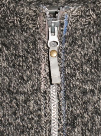 Mitte markiert, links und rechts von der Markierung Nahtband aufgesteckt und aufgesteppt. Dann den Pullover in der Mitte aufgescnitten. Nahtband nach innen geklappt, knapp an der Außenkante mit geteiltem Zickzack abgenäht zum Sichern der Maschen. Die andere Kante des Nahtbands auch festgenäht. Reißverschluß auf das Nahtband gesteckt, festgenäht.
