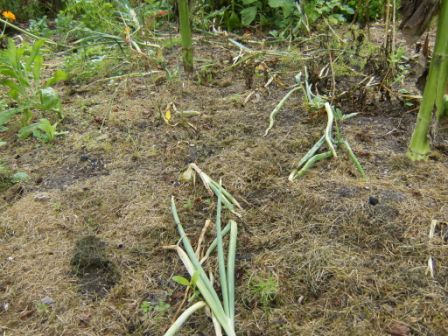 Die Zwiebeln mache ich auch grade raus, die Kartoffeln sind stellenweise noch grün, da warte ich, bis das Laub völlig braun ist.