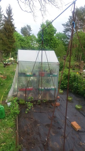 Auch egal. Der Rest wird eh gesät. Ich setzt die dann in Horsten auf 30 cm Abstand. Werden jetzt 17 Stangen bzw. Schnüre (hab noch nicht alle dran) und 5 weitere für Prunkbohnen. Die mach ich mehr aus Spass, aber Bohnen und Eier sind das einzige, wo wir uns zu 100% selbstversorgen. Und wir essen gerne Bohnen. Dafür reichen die ca. 3 m Gestell. Als wir noch zu sechst waren, hatte ich zwei dieser Gestelle.