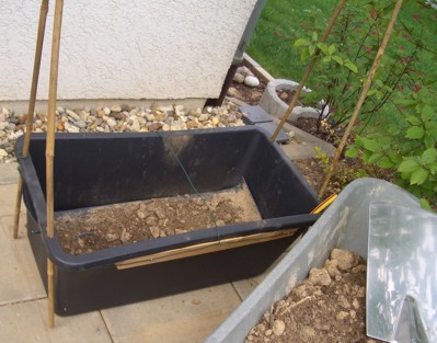 Siehst du das gelbe Garteschlauchstück im 3. Bild, das aus den Mauerkübel guckt? Der Schlauch geht bis runter in die Wasserkammer und guckt im fertigen Kübel oben aus der Erde raus.