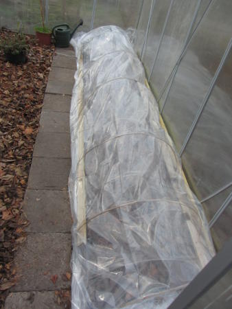 Aber eben, dieses Jahr ist die Anzucht etwas aus dem Ruder gelaufen. Wenn die Tomaten keimen und pikiert werden, müssen die Andenbeeren, Paprika und Chili weichen. Hab mal Testweise eine andere Baschdelei im Gewächshaus gestartet. Bin mal gespannt, wie sich die gemessenen Höchst- und Tiefsttemperaturen im Gewächshaus, außerhalb, unter dem ersten Tunnel und dem 2. Doppeltunnel verhalten. Wenn das passt, kommen die Pflanzen da drunter. Dann können sie sich gleich an das ideale Licht vom großen Planeten gewöhnen. An warmen Frühlingstagen kommt die Folie in die Ecke, damit das da drunter nicht zu heiß wird.