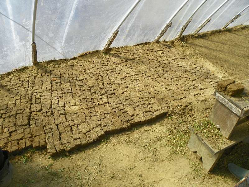 - Mit diesem Werkzeug werden die Würfel dann seitlich abgestochen, und zulezt dann im Gewächshaus nochmal mit einem Brotmesser "feinberbeitet"