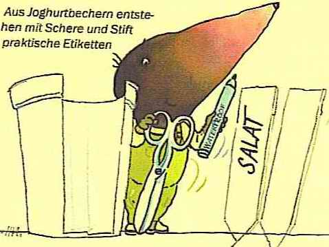 Preiswerte Etiketten kann man aus Joghurtbechern herstellen: Man schneidet die Becherwand in angespitzte Längsstreifen und beschriftet sie mit einem Permanent-Folienschreiber.