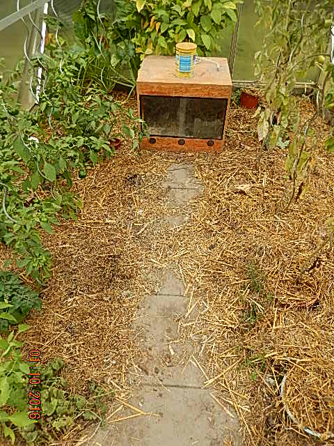 Ich hab die Kiste (ausgedientes Schlangen-Terrarium vom Nachbarn), in der Cora brütete und in der ich ihr die angebrüteten, unbefruchteten Eier gegen die gerade geschlüpften Küken austauschte, mit ins Gewächshaus gestellt. Sie gehen manchmal rein, (Öffnung auf der linken Seite rausgesägt), sind aber meist draußen und schlafen auch immer wieder in einer anderen Ecke des Gewächshauses.
