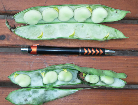 Mit der Ernte habe ich diesmal gewartet, bis die Dicken Bohnen in den Hülsen richtig gut erfühlbar waren. Und dann waren sie auch riesengroß.