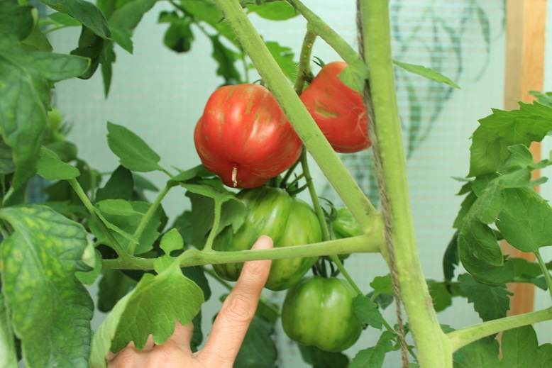 Die Früchte erinnern mich an Gogoshari Striped. Eine Tomate, die paprikaförmig aussieht, gestreift und innen hohl ist. Ideal zum füllen.