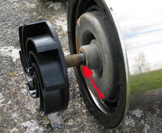 Sobald ich das Gerät zusammenbaute (Unterteil, Schlauch, Aufhängung) und in den Brunnen ließ, stellte sich der Schaden wieder ein. Ich probierte alles: kurzen Schlauch 1 1/2", um den Gegendruck gering zu halten, waagerechte Pumpenpostition, um den Axialdruck zu verringern und sowas.