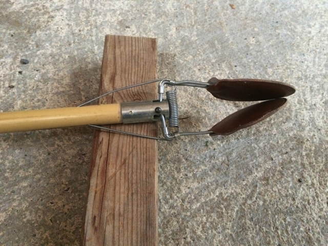 Die andere Art ist eine Art Zange mit langem Bambusstiel. Damit kann man einzelne Früchte festhalten und schonend abpflücken. Siehe Bild.