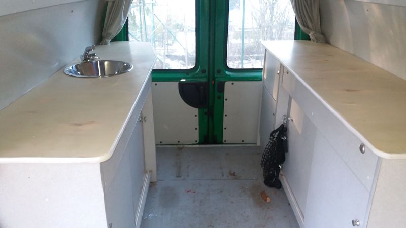Aber ich bin ganz zufrieden. Die Unterseite und die Klappen werden dann eben aus dem Holz und mit der Oberflächenbehandlung wie die Arbeitsplatten. Dann hab ich sogar noch soviel Material, dass ich noch auf der andern Seite nen weniger tiefen Hochschrank und den Rahmen vom "Hundefanggitter" draus bauen kann. (Der Hund muss nach ganz hinten, außer auf der Autobahn, wenn er pennt, hat er die schwachsinnige Angewohnheit ungeduldig vor sich hinzuquitschen, und dann hört man es vorn fast nicht....