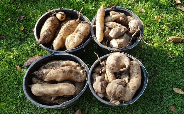 An dieser Stelle war der Boden immer besonders hart. Ich habe deshalb dieses Jahr dort Yakon angebaut, weil ich weiß dass das Ernten des Yakon ein tiefes Buddeln im Erdreich nach sich zieht. Somit war die Ernte eine schwierige Angelegenheit. Schwieriger als ich dachte, weil der Boden nach 10 - 15 cm echt fast mit Beton vergleichbar war. Viele Yakonknollen sind dadurch auch abgebrochen.