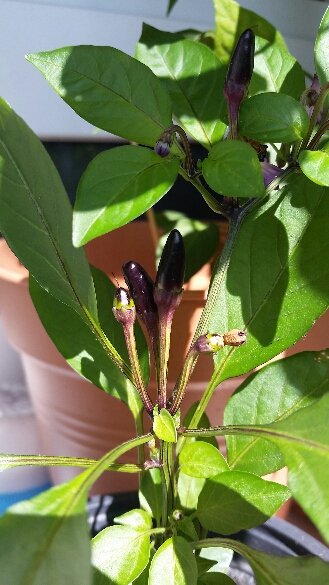 Bei mir gedeihen die Chili ganz gut. ..Eine finde ich besonders hübsch. Im letzten Jahr ein kleines Feuerküsschen aus der Gärtnerei gekauft, dieses Jahr die Kernchen ausgesät und über die dunklen Keinmlätter gewundert. Ich dachte schon, mit denen stimmt was nicht, dann haben sie sich zur absoluten Attraktion gemausert