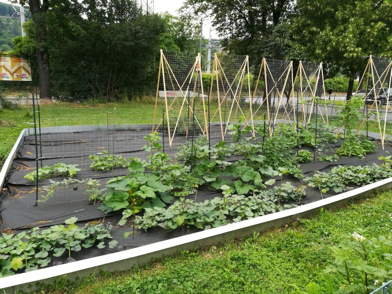 Für die Gurken hatte ich dieses Jahr einfach Estrichmatten an drei Stangen montiert. Da die Sorten die ich habe relativ kompakt bleiben habe ich die Matten im Querformat verwendet also ein Meter hoch und zwei Meter breit. Das funktioniert recht gut so lange es keinen starken Sturm gibt, der die hohen Gerüste daneben umhaut wie es bei mir am Ende der Saison der Fall war...