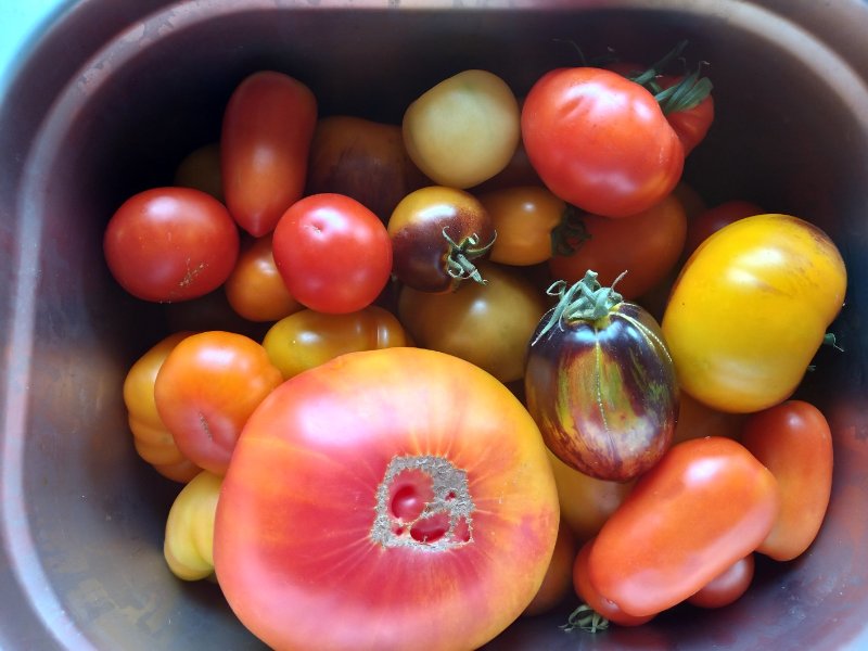 Im Juli ging es dann richtig los mit der Ernte. Trotz extremer Trockenheit und ordentlicher Hitze, haben wir doch einiges aus dem Garten geholt. Obwohl wir die Gewächshäuser aufgebaut haben, haben wir sie nicht "in Betrieb" genommen. Die Dürre hat sich Juni schon so abgezeichnet, dass ich wusste, dass meine Pflänzchen mit dem späten Start nicht mehr wirklich was werden würden. Ohne effizientes Bewässerungssystem hätte mein Tag nur aus Gewächshaus-Gießen bestanden. Ein Paar Tomaten, Paprika und Gurken sind dann einfach in die Beete gewandert, was ja kein Problem war, da es eh nicht geregnet hat :hmm: