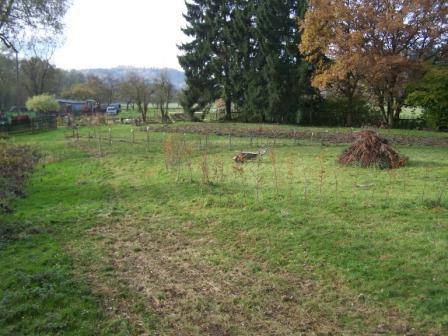 Den Kartoffelacker machten wir wieder platt . Unsere kleine Motorhacke glühte. Dann , Herbst 2010, gingen wir zu Viert in den Garten. Jeder mit einem Luftbild des Grundstückes und malten unsere Vorstellungen hinein. Anschließend verglichen wir und besprachen die gestalterischen Ideen und die naturgegebenen Möglichkeiten. Erstaunlicherweise gab es kaum größere Abweichungen und so begannen wir am nächsten Tag mit der Anlage einer etwa 20 x 25m großen Sonnenfalle umringt von einem "Wall" , gestaffelt mit Beerensträuchern, Beerenstämmen, Viertel-, Halb- und Hochstammobstbäumen. An der nördlichen Seite ein langes Hügelbeet, aus Astschnitt, Mulch und Komposterde. BILD 4 Folgt
